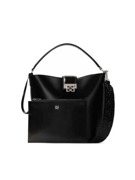 Elegante cintura realizzata in pelle naturale di alta qualità in un classico colore nero. Il modello è rifinito con una fibbia rettangolare in argento dalla delicata lucentezza, che conferisce all'insieme una sottile eleganza. Un dettaglio distintivo è il passante logato, che sottolinea il carattere del marchio dell'accessorio. Con il suo design minimalista, la cintura si abbina perfettamente ad abiti formali e casual, aggiungendo un tocco sofisticato.