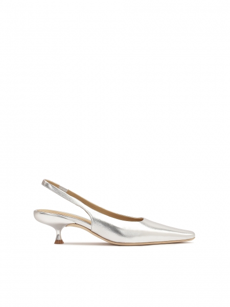 La piccola borsa baguette è realizzata in pelle naturale argentata lucida di alta qualità, che le conferisce un aspetto elegante e moderno. La borsa ha una classica forma oblunga, con lati arrotondati, che la rende sottile ed elegante. La tracolla corta permette di portarla in diversi modi: in mano, sull'avambraccio o sulla spalla. La parte anteriore della borsa è ornata da un sottile logo del marchio, che non domina l'insieme, ma sottolinea solo il carattere lussuoso del prodotto. La borsa baguette è l'accessorio perfetto per gli outfit eleganti da sera, ma funziona bene anche come parte di outfit casual e urbani, aggiungendovi un po' di glamour e lusso.